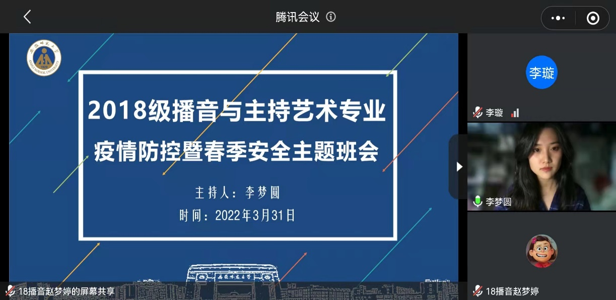 本网讯(文/李璇 图/赵梦婷)为贯彻落实学校关于疫情防控工作的部署和要求,做好疫情防控期间引导毕业生就业工作,德赢AC米兰合作伙伴2018级播音与主持艺术专业于2022年3月31日20:00在腾讯会议召开“疫情防控暨春季安全”主题班会,班会由辅导员李梦圆老师主持。