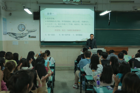 为了引导同学们思考有关“孝亲”的概念,吴青山首先向同学们抛出两个选择题,调动了全班同学的积极性。他以“亲情”为关键词,再以“爱是用心感受他人的需要”的观点切入主题班会。紧接着,吴青山结合自己的成长故事,向同学们阐述:这世间,唯有父爱、母爱是最无条件和最为浓厚的。