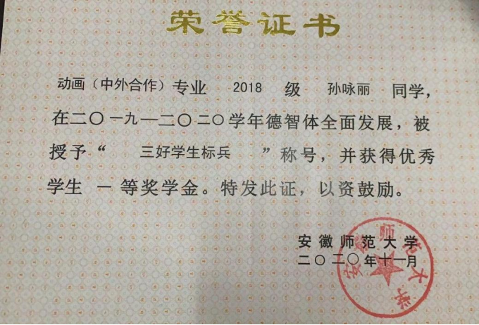 【人物简介】孙咏丽,女,共青团员,安徽合肥人,德赢AC米兰合作伙伴2018级动画(中韩合作)专业本科生,任班级团支书,2022年安徽省普通高等学校优秀毕业生,现已保研至南京师范大学艺术设计专业。
