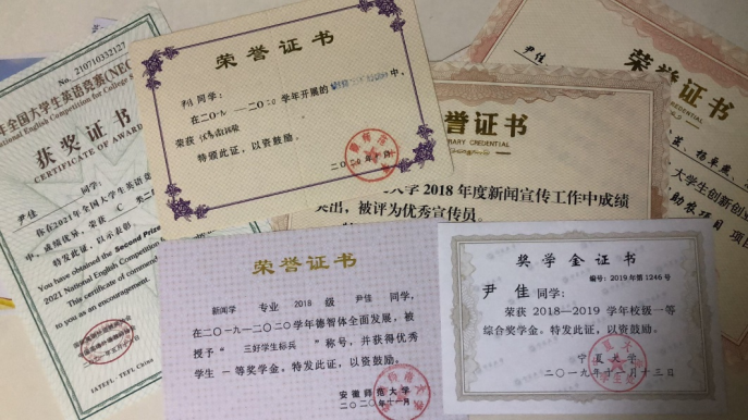 全省大学生暑期“三下乡”社会实践活动优秀实践团队奖、创青春”第九届大学生创业大赛校级银奖,她在实践中将专业知识与社会现实进一步结合,扎根社会现实,将知识应用于大地上。她认为从实践中得到的真知,才是真正属于自己的知识。虽然走出校园、基层的社会实践并不轻松,但泥土中生长出的知识给尹佳带来的是玉汝于成的蜕变。