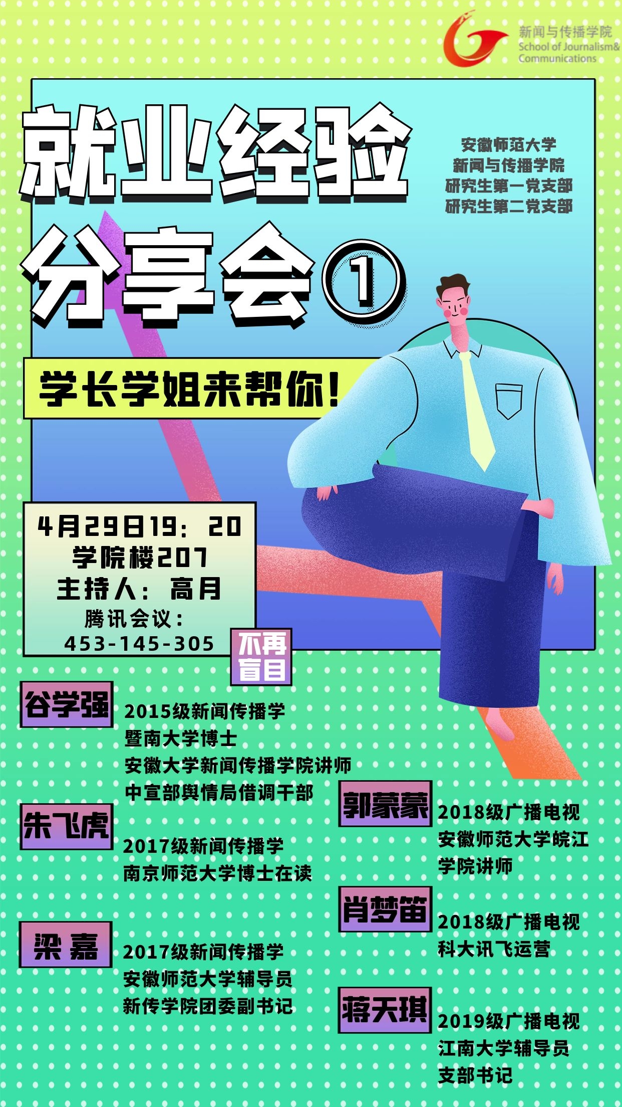 本次就业经验分享会邀请2015级新闻传播学谷学强、2017级新闻传播学朱飞虎、梁嘉、2018级广播电视郭蒙蒙、肖梦笛、2019级广播电视蒋天琪六位优秀毕业生代表分享就业经验。六位同学分别从目标确立、信息获取、笔试及面试技巧、工作经验等方面将自己的经验倾囊相授,针对研究生就业问题进行了现场交流。帮助同学们加强对不同就业方向的认识和了解,明确个人职业生涯规划,帮助同学们进行更高质量就业。