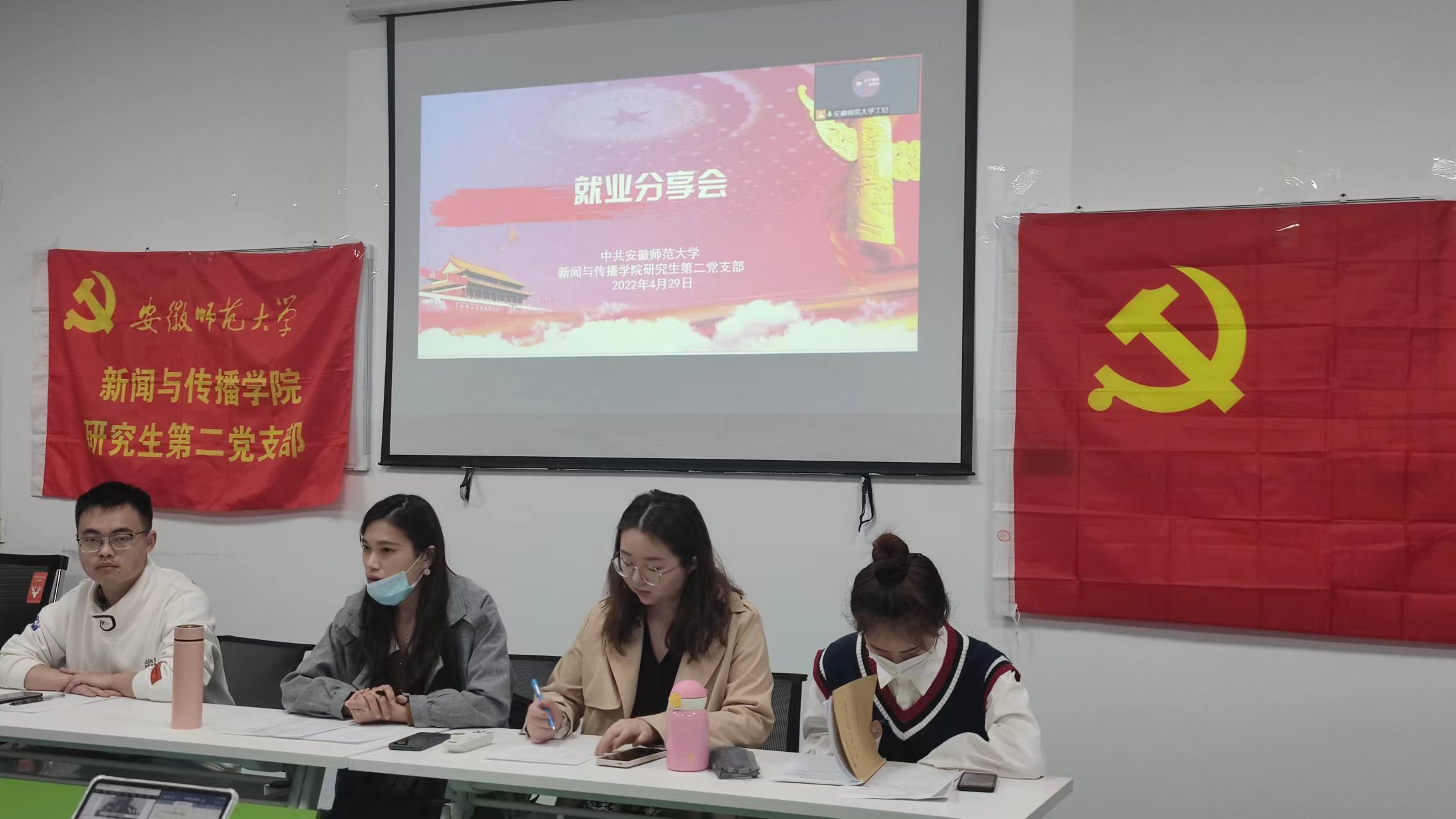 后半程,由广播电视专业的三位毕业生为在座党员倾囊相授就业心得。目前担任科大讯飞运营岗位的肖梦笛从学习、生活、工作三个方面为切入点,提醒同学们在学习上树立终身学习的意识,在学习过程中提升自我;在求职过程中注意简历的格式规范,凸显实习工作经验,善于归纳总结,突出成果,勇于挑战;在生活上要保持快乐,保持初心,保持生活与工作之间的平衡。最后,她也提醒同学们在疫情期间要提前准备,把握机遇,鼓励大家早日确立就业目标,以饱满的姿态迎接人生的新阶段。与肖梦笛同届的郭蒙蒙现任vwin德赢ac米兰官方网皖江学院助教。郭蒙蒙首先介绍自己攻读研究生的过程以及在疫情期间如何面对工作和家庭的压力,并回应如何报考高校岗位等大家急切关注的问题。同时,她将自己求职过程中的失败原因进行总结,提醒同学们尽早提升自身实力,实学实干,及早行动实现自我人生价值的新跨越。鼓励同学们抓住机遇,树立正确的择业观,就业观,早就业,就好业,从容面对一切困难。最后,江南大学专职辅导员蒋天琪补充说,首先要向导师和优秀的师兄师姐请教经验,往往能够事半功倍;其次,在求职过程中要稳步发展,不要好高骛远,要把握好各种机遇;最后,蒋天琪同学鼓励广大毕业生,逐梦青春,不负韶华,带着满腔热血投入到为祖国奉献的事业中去。