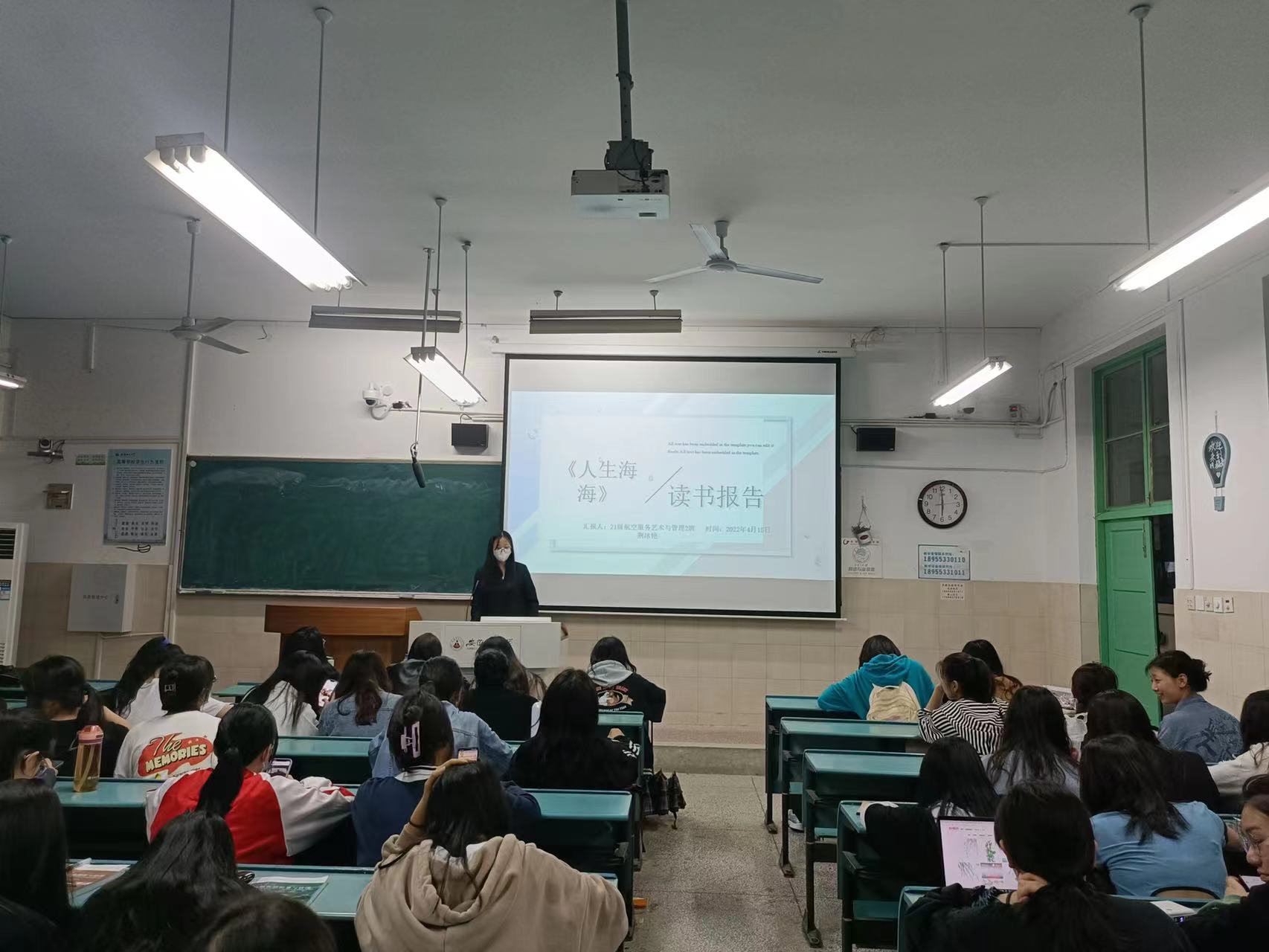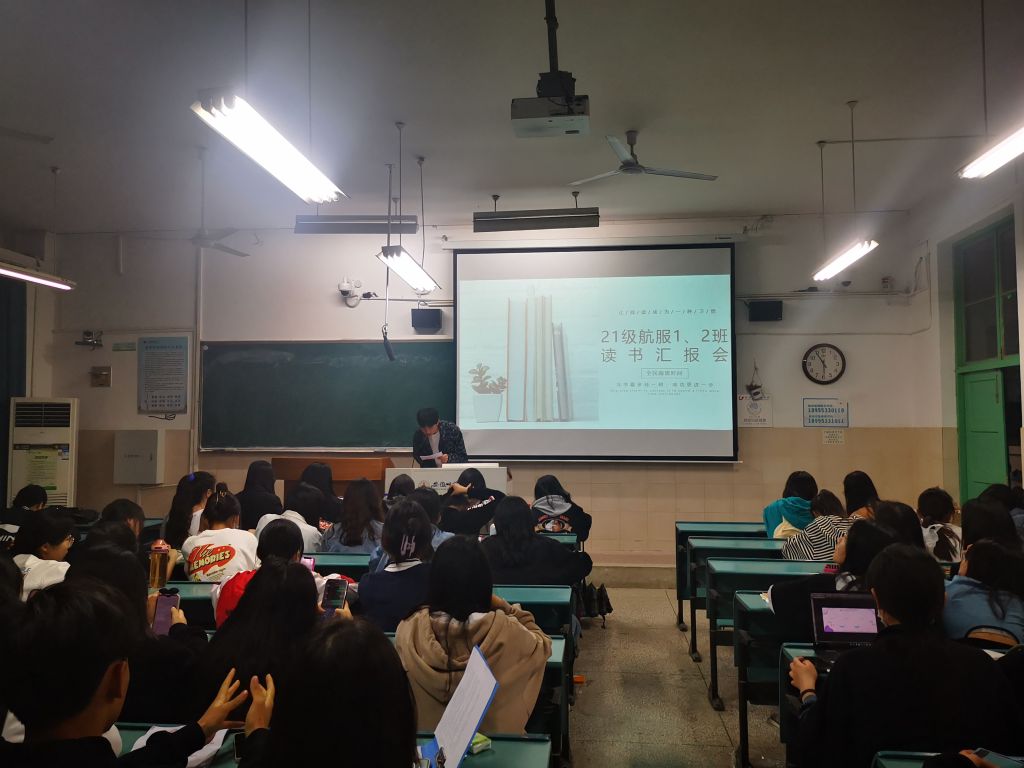 为响应读书月号召,提高大家的阅读兴趣以及个人涵养,4月28日晚上7点半,2021级航空服务艺术与管理1、2班教室2050504举行读书汇报会。会议由班长杜泽桐主持,辅导员张雁和全体同学参加。