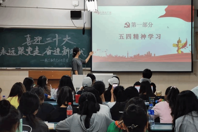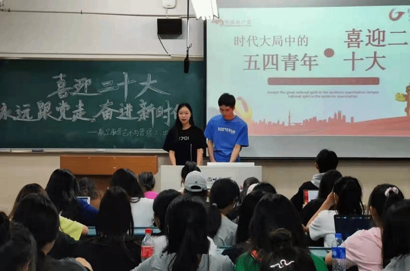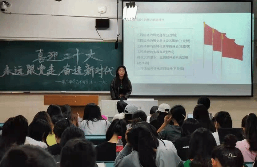 本网讯(德赢AC米兰合作伙伴 谢欣雨、赵心语)5月3日晚上七点,航空服务艺术与管理三四班在行知楼2050505教室举行了庆祝建团一百周年暨喜迎二十大主题团日活动。此次活动由三四班团支书孙盈、邹永亭主持,航服三四班全体同学参与。