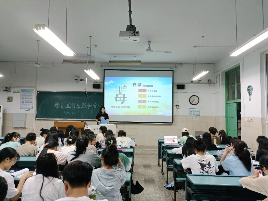 此次主题班会是为了加强大家对毒品知识的了解,树立健康的观点,共同抵制毒品。会上,大家共同观看禁毒宣传公益短片《青春不是挥霍的筹码》《别让“我以为”变成“我后悔”》,全省禁毒“云知识”短视频大赛一等奖作品《无孔不入的第三代毒品》《逝去的幸福》,通过宣传片初步了解毒品的危害,