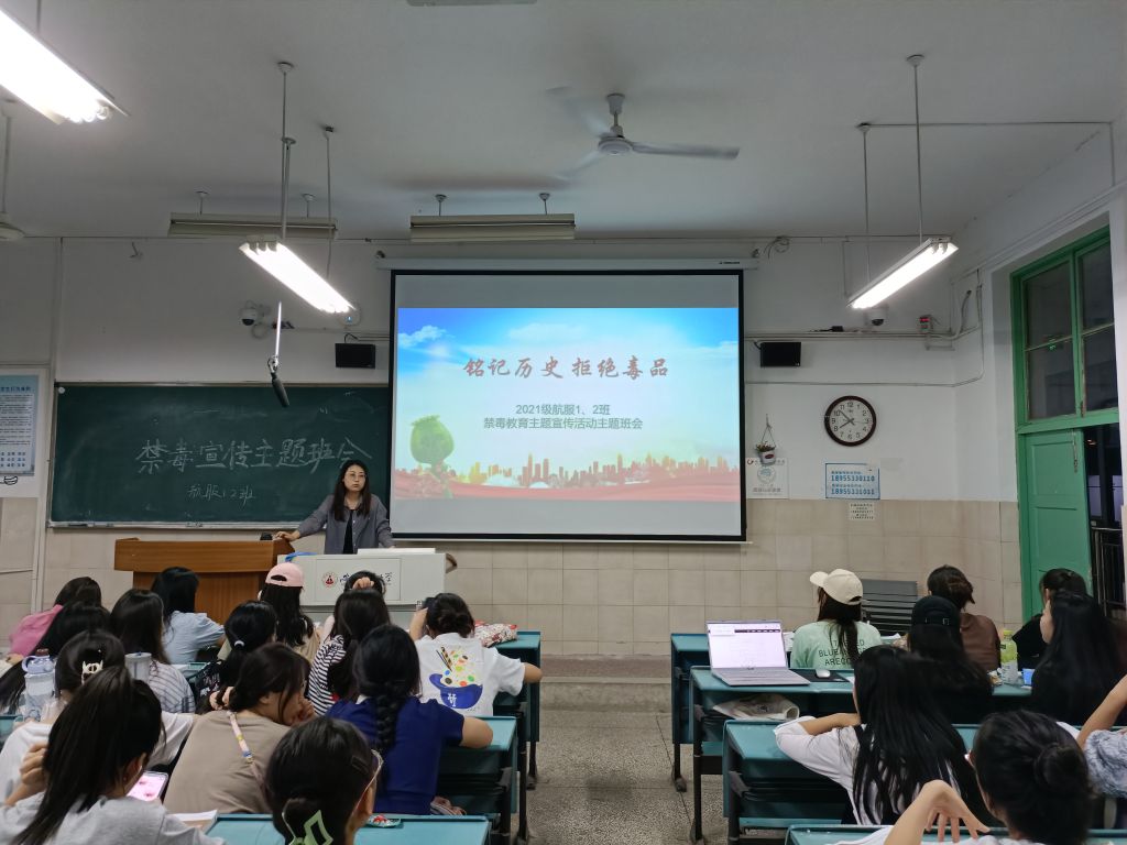 本网讯(文/潘晨 图/李鑫鑫)2022年6月12日晚,21航空服务艺术与管理1,2班于晚自习教室2050504举行了禁毒知识宣传主题班会。参加本次会议的人员有航空服务艺术与管理1,2班成员,辅导员张雁,会议由思政委员潘晨主持。
