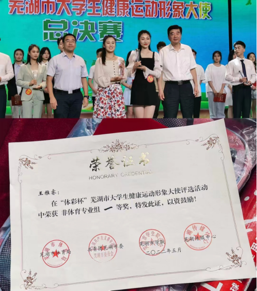 5月30日晚,在芜湖市传媒中心演播厅举行的决赛上,通过特长运动展示、自我介绍、现场教学运动项目和“我为芜湖体育代言”等环节进行比拼。比赛中,王雅睿同学将多年的舞蹈功底与灵活的临场发挥能力相结合,高质量的完成了主办方的比赛要求,并以认真的态度和优异的表现获得非专业组唯一的一等奖。
