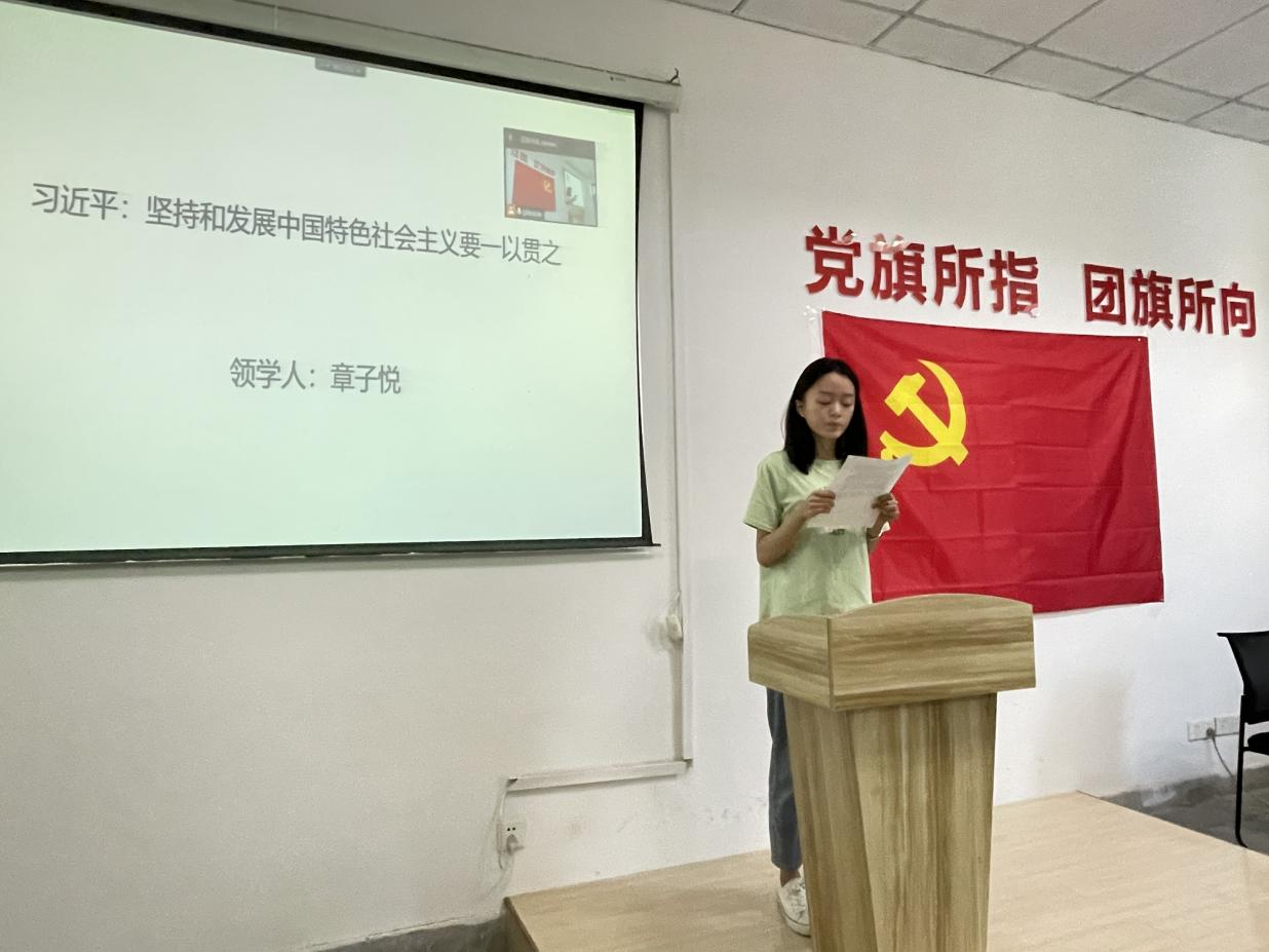 随后,章子悦领学了《中共中央政治局会议建议 中国共产党第二十次全国代表大会10月16日在北京召开 中共中央总书记习近平主持会议》及习近平总书记重要文章《坚持和发展中国特色社会主义要一以贯之》。同时,朱梦婕同学结合本月时事,领学《台湾问题与新时代中国统一事业》白皮书。