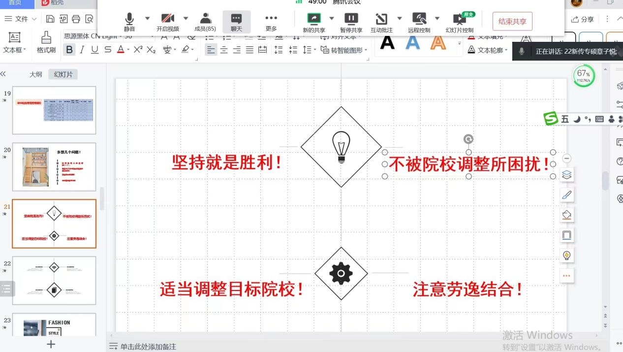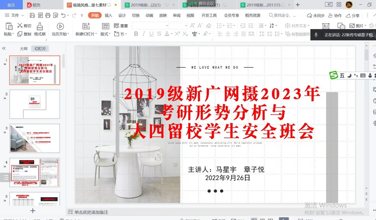 9月26日晚,2019级新闻、广告、网络与新媒体、摄影四个专业在班主任马星宇的主持下集体召开了“2023年考研形势分析与大四留校学生安全班会”。会上马星宇向同学们分析了目前的考研现状,就本阶段备考择校、复习状态做了详细梳理,并与章子悦老师就留校学生安全问题作了强调与说明。