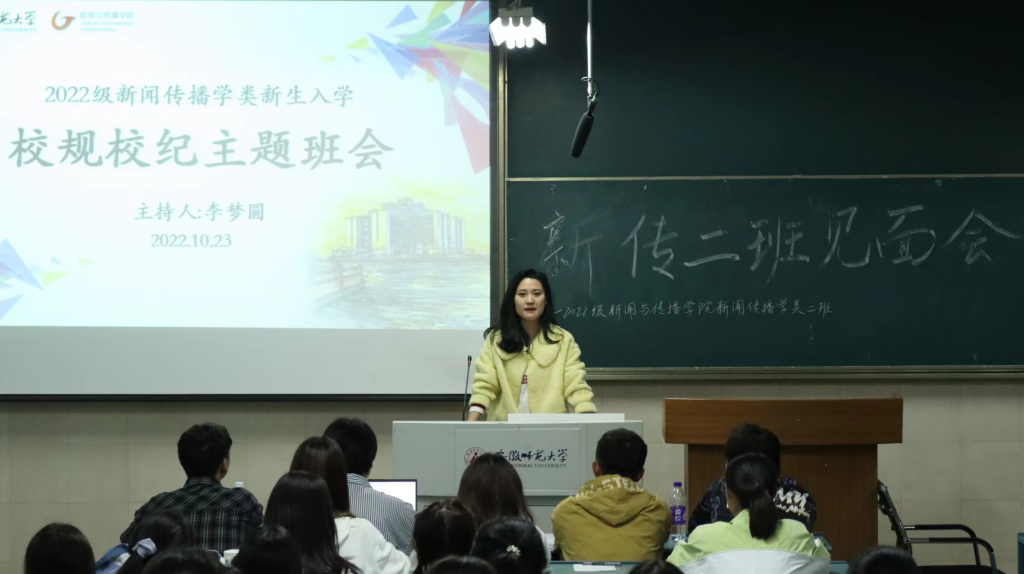 10月23日晚,2022级新传二班在行知楼5号楼302教室举办主题班会,由辅导员李梦圆和班长杨志远主持,参会人员为全体新传大类二班同学。