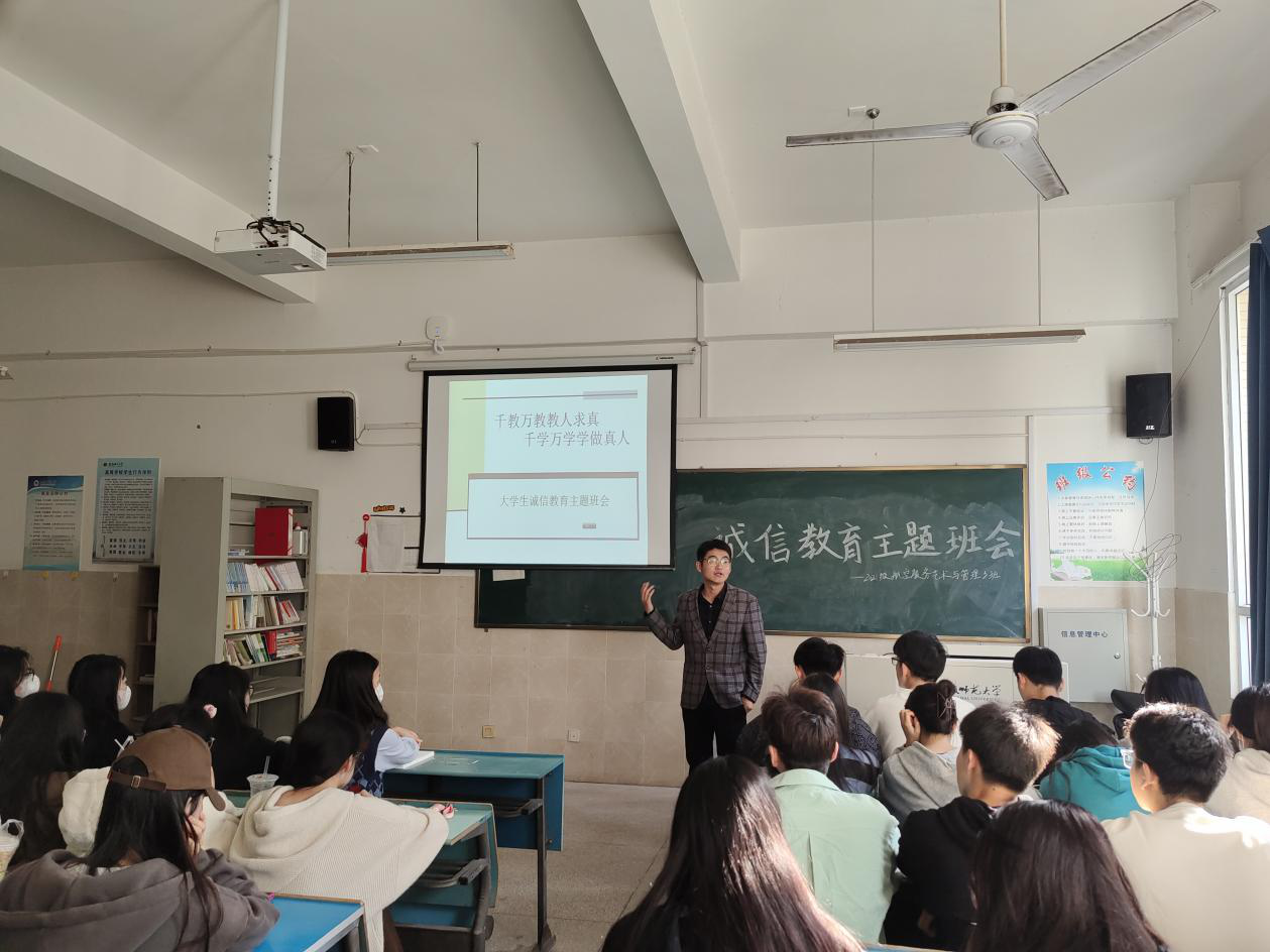 会上,刘熠以校庆石铭刻的行知先生语句“千教万教教人求真,千学万学学做真人”引入主题,通过引用《论语》内容和具体案例教育同学们诚信的重要性,并且提出了“谈谈身边的失信行为”和“谈谈对提升大家的诚信水平有哪些建议”等问题,在进行诚信教育的同时引发同学们思考。同学们认真听讲,积极配合,踊跃举手进行互动。“诚信如何为?”问题讨论结束后,刘熠将习近平总书记提出的十六字箴言“心存敬畏,严于律己,慎独慎微,襟怀坦荡”送给同学们,并再次申明了诚信在生活中时时需要、事事需为,并借此警醒同学们诚信考试的重要性。