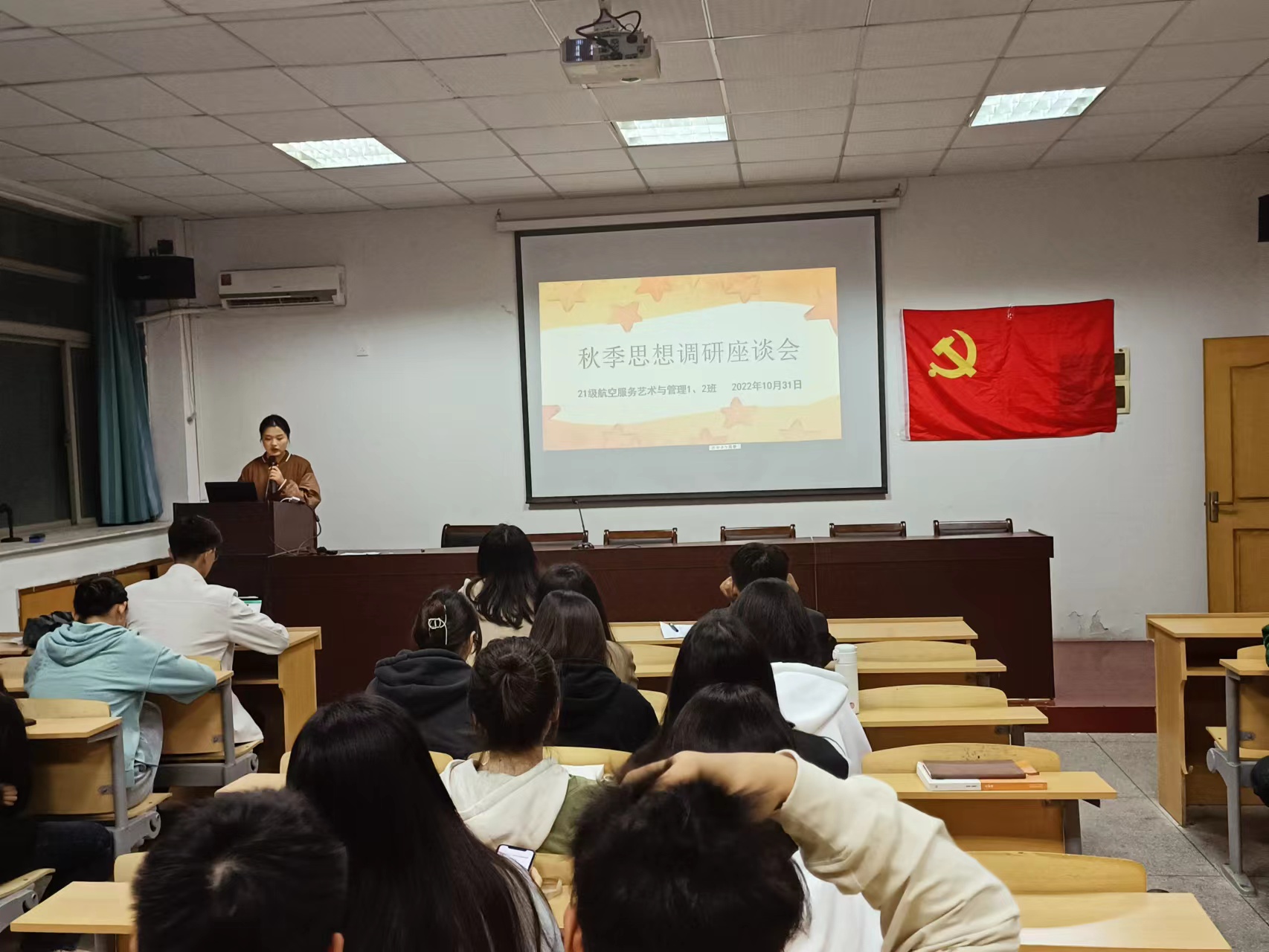 本网讯(文/李苗苗 图/刘春燕)10月31日晚上8点,2021级航空服务艺术与管理1、2班寝室长及学生代表在德赢AC米兰合作伙伴4楼会议室参加秋季思想调研座谈会,本会议由思政委员李苗苗主持,辅导员张雁参加。