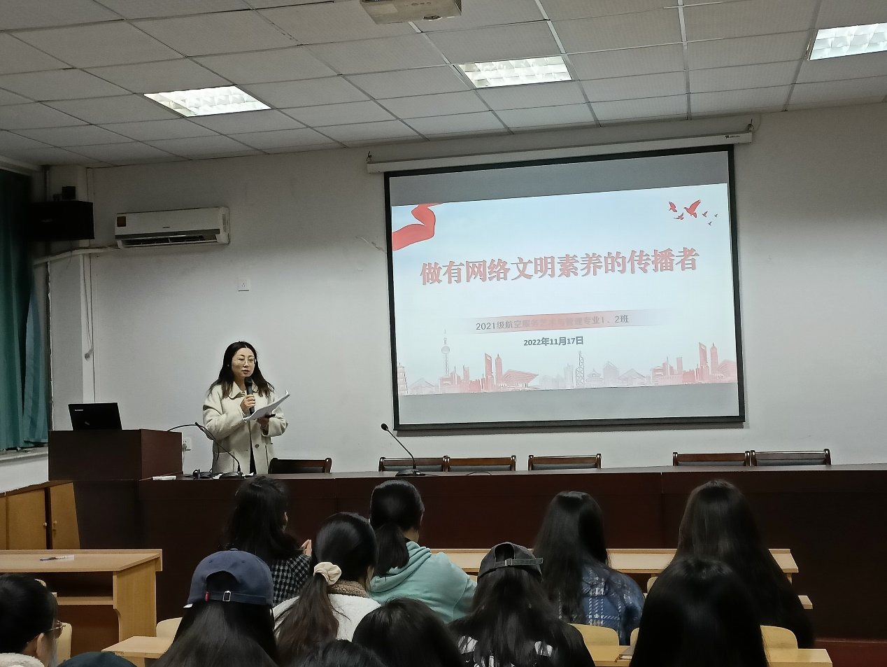 本网讯(黄海玥、刘春燕)随着网络科技的逐步发展,网络应用的逐渐普及,为进一步传播网络文明,培养学生网络文明行为,引导学生绿色上网,文明上网。11月17日晚上7:30,21级航空服务艺术与管理专业1、2班在学院四楼会议室召开网络文明素养主题班会,会议由辅导员张雁主持,全体同学参加会。
