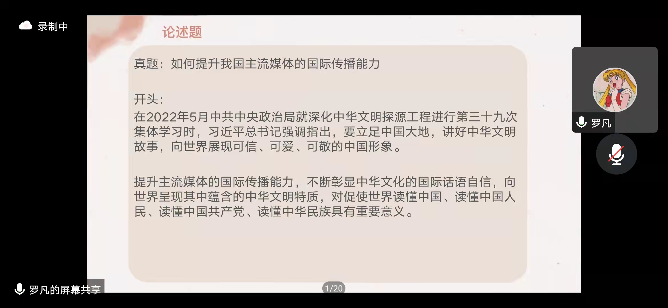 围绕亲身经历,罗凡以新传研考简答和论述题答题技巧为分享主题,分类型分重点地提炼了课本内与课本外简答答题的技巧和框架,并依据个人经验讲解如何做好题目拆分,又如何在拆分的基础上做好进一步解释解答。在简答题环节,罗凡剖析了往年南京师范大学新传研考的出题脉络,她指出简答题的“根”在于书本,要能结合自己的基本情况进行文本输入,根据历年考卷整理常考重点,做好简答内容概括以及易混淆概念的甄别,按题型按专题有效复盘,做好充分的准备。同时,罗凡结合历年真题,与同学们分享了论述题题型的应对策略,她强调论述题不单是知识储备的博弈,更要求逻辑思维的深化。借此机会罗凡向与会同学介绍了自己一直以来做题复盘的思路技巧,鼓励同学们多看论文,也多做总结,在增强总体知识理解与分模块知识储备的基础上按专题划分拆解答题框架,提炼论文观点,切忌死记硬背,而是将观点中的精粹内化于心、外化于行,形成自己的论述题开头模式,并在日常积累中注重预先针对不同题型梳理相应答题框架,做到有观点有案例,使论述更加翔实有力。