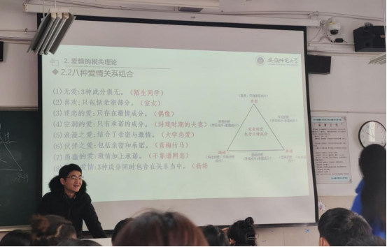 会上,刘熠将恋爱理论知识与古诗文《陌上桑》结合,声情并茂地向讲解观点,并从日常化的角度,极大程度地调动起了同学们的对于讲解内容的兴趣。刘熠还带领同学们温习大一时期的心理健康教育课程内容,强调了八种爱情关系,告诫同学们要树立正确的恋爱观,已有恋爱对象的同学们则要与自己的恋人保持着健康的爱情关系。