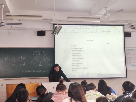 刘熠带领航空三、四班的同学们集体朗诵当代诗人舒婷描写爱情的著作《致橡树》,让同学们在生动形象的比喻中感受着作者所想表达的爱情观,进而指出好的爱情应该是相互独立而互相促进。教导同学们不要盲目追求爱情,而是顺其自然,正所谓“鲜花盛开,蝴蝶自来”。比起对于爱情的一味追求,其实将更多的精力放在自我提升上,可能会有更多意想不到的成效。