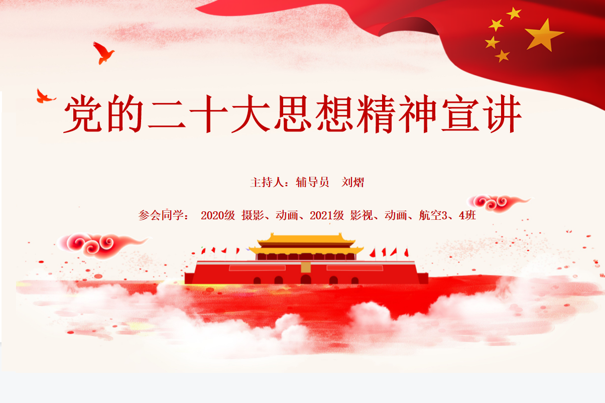 为深入学习宣传贯彻党的二十大精神,同时保障同学们平安、充实度过寒假生活,近日,动画、摄影、航空班级组织召开学习党的二十大精神暨寒假安全主题教育班会,20动画、摄影以及21动画、摄影、航空三班、四班全体同学线上参与听讲,会议由辅导员刘熠组织并召开。