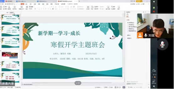2月6日下午3:30,20、21级动画、摄影、航空三个专业召开新学期开学准备班会,对寒假生活进行总结,并对新学期的相关工作做出安排。会议由辅导员刘熠老师主持,20、21级动画、摄影、航空专业全体学生参加。