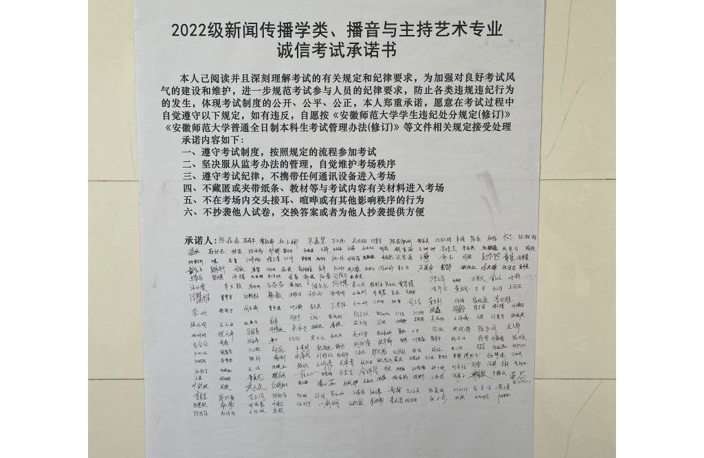 会上,李梦圆重点强调了考风考纪问题,严正指出要践行诚信考试的相关要求,严格抵制作弊行为,并列举相关违纪处罚案例提醒同学们要引以为鉴,端正考风、严肃考纪。李梦圆带领同学们仔细阅读了考试管理方法,要求同学们要牢记于心。最后,全体学生依次签署诚信考试承诺书。