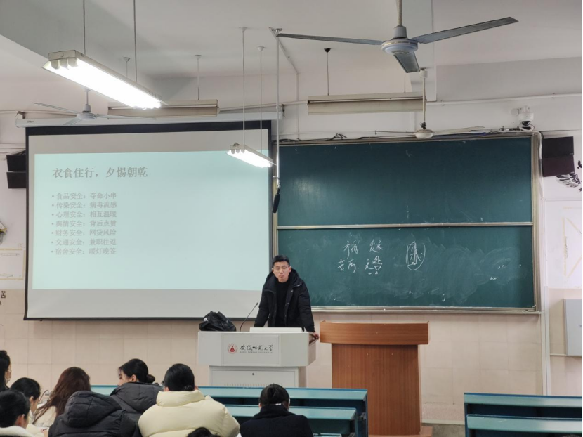 会上,辅导员刘熠予以同学们简单的问候,并向同学们简述了有关安全教育的相关知识,提醒同学们做好安全防范,遇到有安全隐患的事物要及时作出反应,增强个人和集体的忧患意识。接着刘熠例举有关案例,用真实案例对同学们发出警醒,进一步增强了同学们的安全意识、防范意识和责任意识。