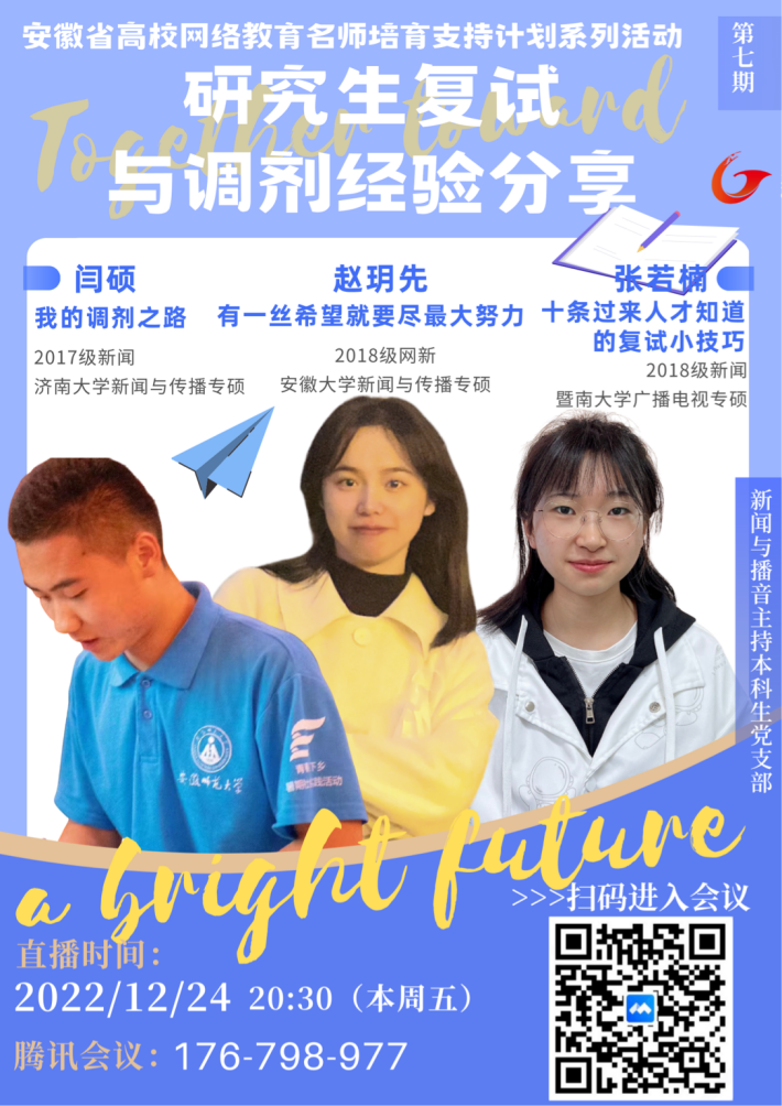3月24日晚,学院研究生复试与调剂经验分享会以线上会议的形式举行,由来自2017级新闻学的闫硕、2018级网络与新媒体的赵玥先、谢妮以及2018级新闻学的张若楠来为今年参加考研复试及调剂的同学做经验分享。会议由马星宇老师主持。毕业班辅导员章子悦、李露露及今年考研进复试同学参加。
