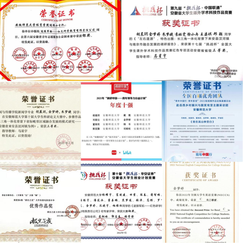 她参加各种专业赛事,在实践中检验磨砺自己的能力。曾获全国大学生英语竞赛全国二等奖、大学生创新创业训练计划国家级立项、“皖”美乡村——安徽省乡村振兴短视频大赛优秀作品、第十届“挑战杯·华安证券”大学生创业计划竞赛省级三等奖等。2023年2月,她参加安徽省委宣传部组织的“新时代新征程新伟业”大规模集中采访,跟随各大媒体,走进施工现场、田间地头、街头巷尾,鲜活反映各行各业的点滴变化,采访万家灯火背后坚守岗位的平凡人,拜访人大代表、为两会预热,用自己的笔触呈现活力中国、温暖中国、幸福中国。