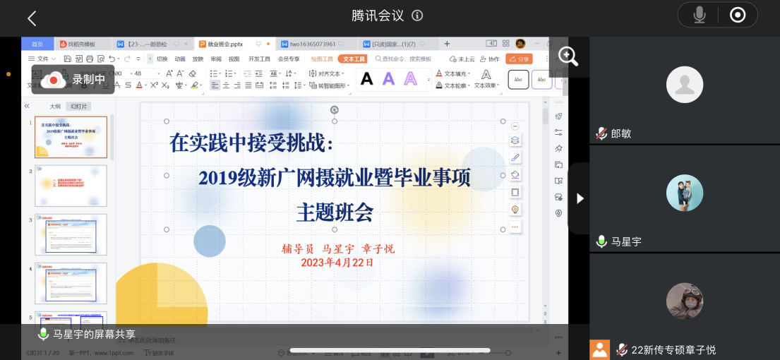 4月23日晚21时15分,2019级新闻、广告、网络与新媒体、摄影专业在线上召开了主题为“在实践中接受挑战”的就业暨毕业事项主题班会,辅导员马星宇主讲,章子悦主持。