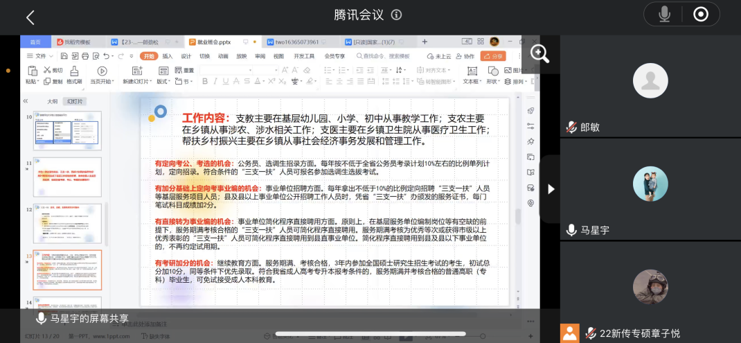 随后,马星宇为同学们提供了几种落实就业去向的方式,包括:三方就业协议、劳动合同、就业证明函、自由职业,并说明了每种就业去向的特点以及与其他去向的差别,鼓励同学们们积极就业。马星宇重点与同学们讨论了近期体制内的就业新选择,他认为:作为一种过渡性就业,“三扶一支”、“西部计划”十分值得考虑。“用2-3年时间完成了基层工作的经验,换来的是人生宝贵的经历,撬动的是考研、考公、考编的优惠条件!”马星宇说道。当前,国家越来越注重基层经验,如果说读研是接受学校的进一步教育,参加“三扶一支”、“西部计划”,实际上也是在接受祖国的挑选、经历的是社会课堂的教育。接受教育的同时,“三支一扶”能够拥有定向考研、考公的机会,有直接转为事业编的机会,更有创业优惠政策、获得大学学费补偿的机会。他表示,“三扶一支”、“西部计划”都是面向祖国最需要的地方和基层就业,于人生而言是一场难得的经历,对于更好地认识国情民情社情,增进对祖国传统文化的了解大有益处;在基层与群众直接打交道,也更能磨砺自己的性情,增强自己的本领。