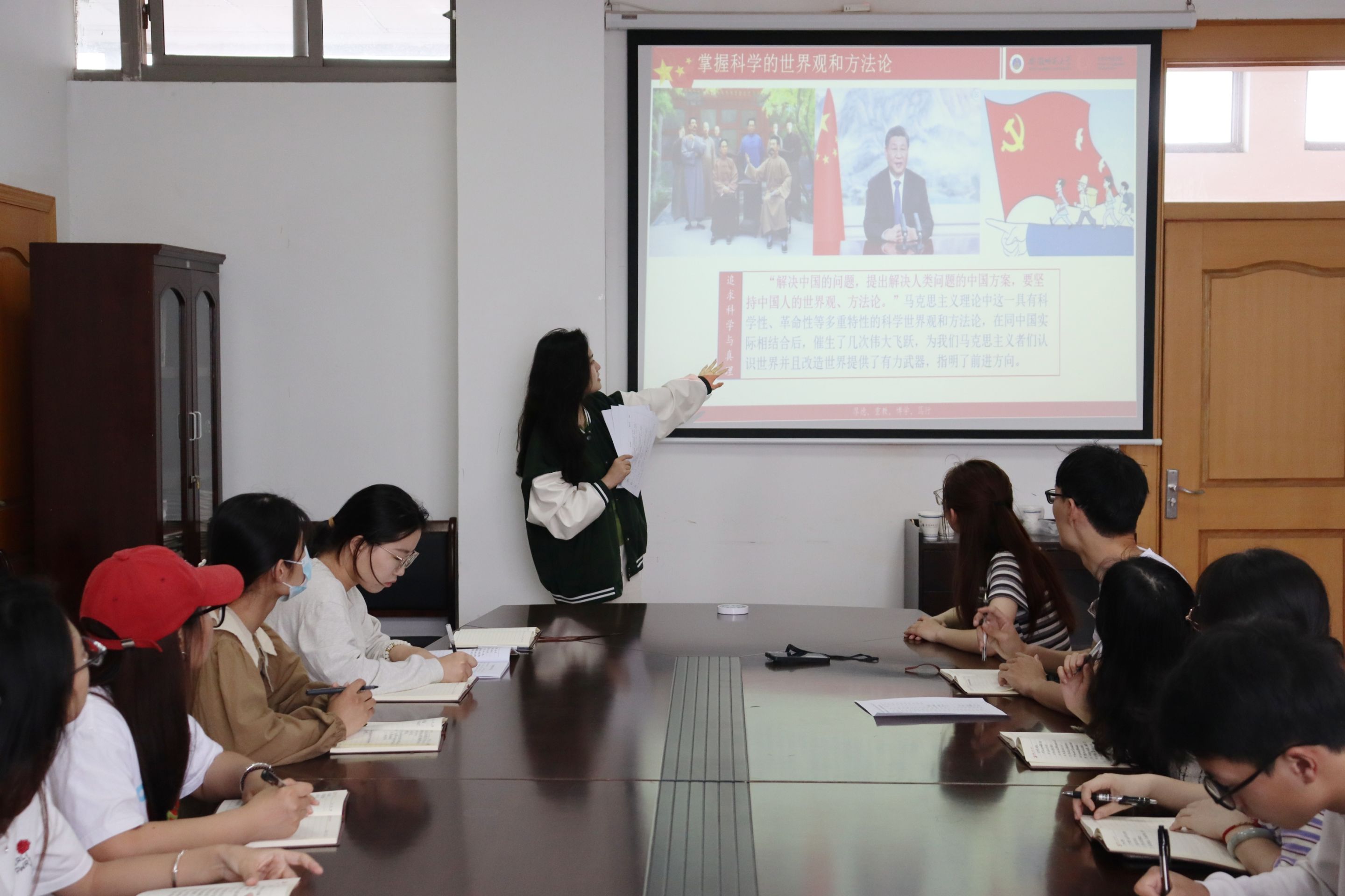 李梦圆带领全体党员回顾了马克思主义与习近平新时代中国特色社会主义思想的实质内核,强调弘扬马克思主义,强化执政党能力建设,归根结底是要坚持把马克思主义基本原理同中国具体实践相结合、同中华传统优秀文化相结合。指出我们要在新时代下高举习近平新时代中国特色社会主义思想大旗,把握好习近平新时代中国特色社会主义思想的世界观和方法论,坚持好、运用好贯穿其中的立场、观点、方法,运用其解决困扰我们发展的实际问题,为强国建设、民族复兴贡献青春力量。通过本次理论学习,参会的党支部全体党员及预备党员加深了对习近平新时代中国特色社会主义思想的世界观和方法论的认识,并进一步增强了对党的创新理论的理解、领会和把握。