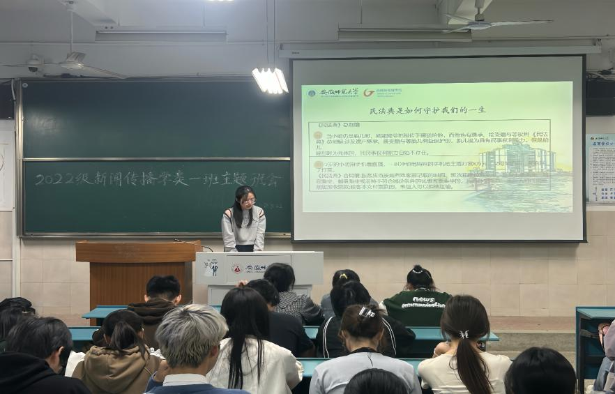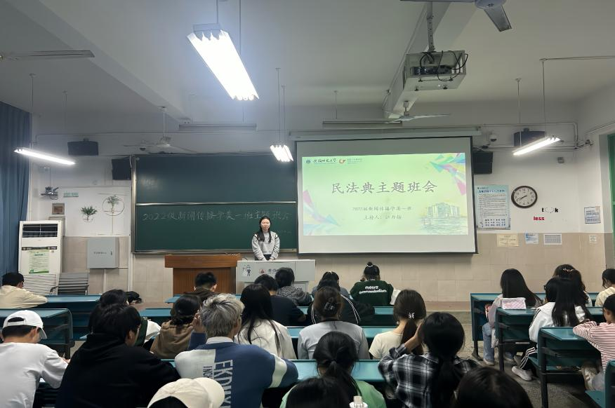 为进一步提高大学生法律意识,切实做好民法典宣传工作,响应全民知法、守法、用法的国家号召,2022级新传一班于5月22日晚在2040304教室开展了民法典主题班会,全体同学及辅导员李梦圆参会,此次班会由团支书江丹扬主持。