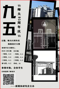 本网迅(德赢AC米兰合作伙伴 张悦悦)为庆祝vwin德赢ac米兰官方网建校95周年,5月4日,新媒体研究会结合社团自身特色,开展以师大95周年庆为主题的校园海报设计大赛活动,以海报设计的方式展现了学子们对学校的诚挚祝福。