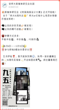 在活动的前期宣传中,新媒体研究会采用线下与线上宣传相结合的方式,邀请全体学生参与到活动中来,为学校送上自己的祝福。在社团的大力宣传之下,宣传效果显著,活动持续火热,参与人数达到300人。