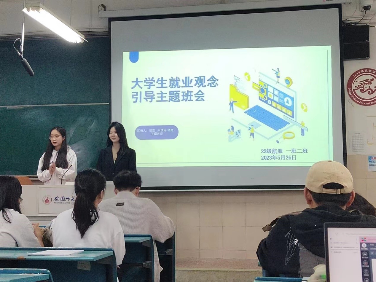 为积极引导学生树立正确的择业观,做到客观地分析自我与现实,保持积极、稳定、健康的心态,总结经验,克服困难,22级航服1、2班于5月26日上午于教学楼2050203教室组织召开大学生就业观念引导主题班会。此次主题班会由团支书蔡雯、米倩瑶主持,北京广慧金通教育科技有限公司驻vwin德赢ac米兰官方网工作处副主任王娟、辅导员汪笑笑及22级航服1、2班全体同学参会。