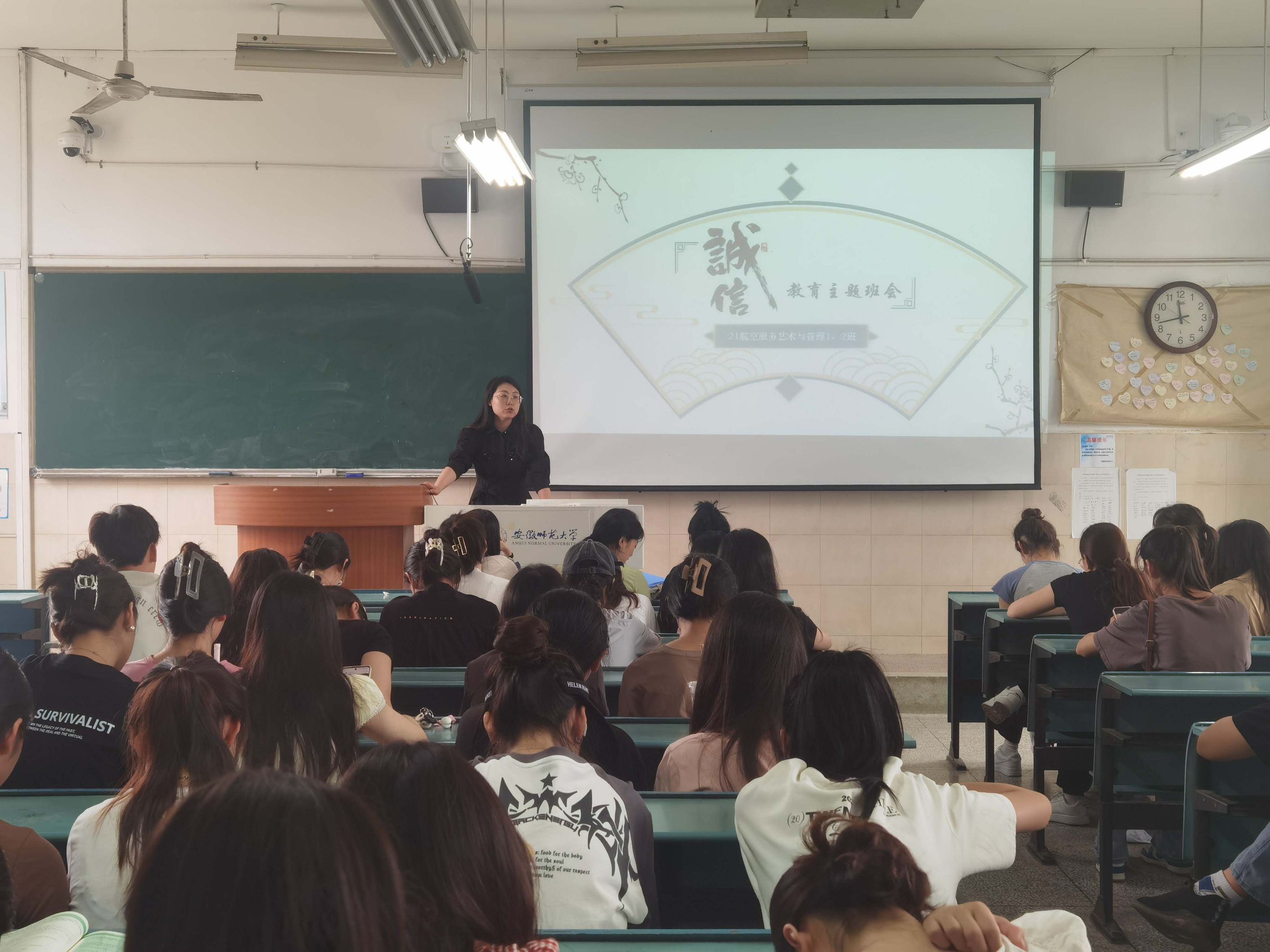 本网讯(文/杜泽桐 图/黄海玥)为了帮助大家树立正确的人生观、价值观、消费观,增强学生诚信意识,21级航服1、2班于5月31日上午,在教室2050505开展了以“诚信教育”为主题的班会。此次主题班会由思政委员李苗苗主持。