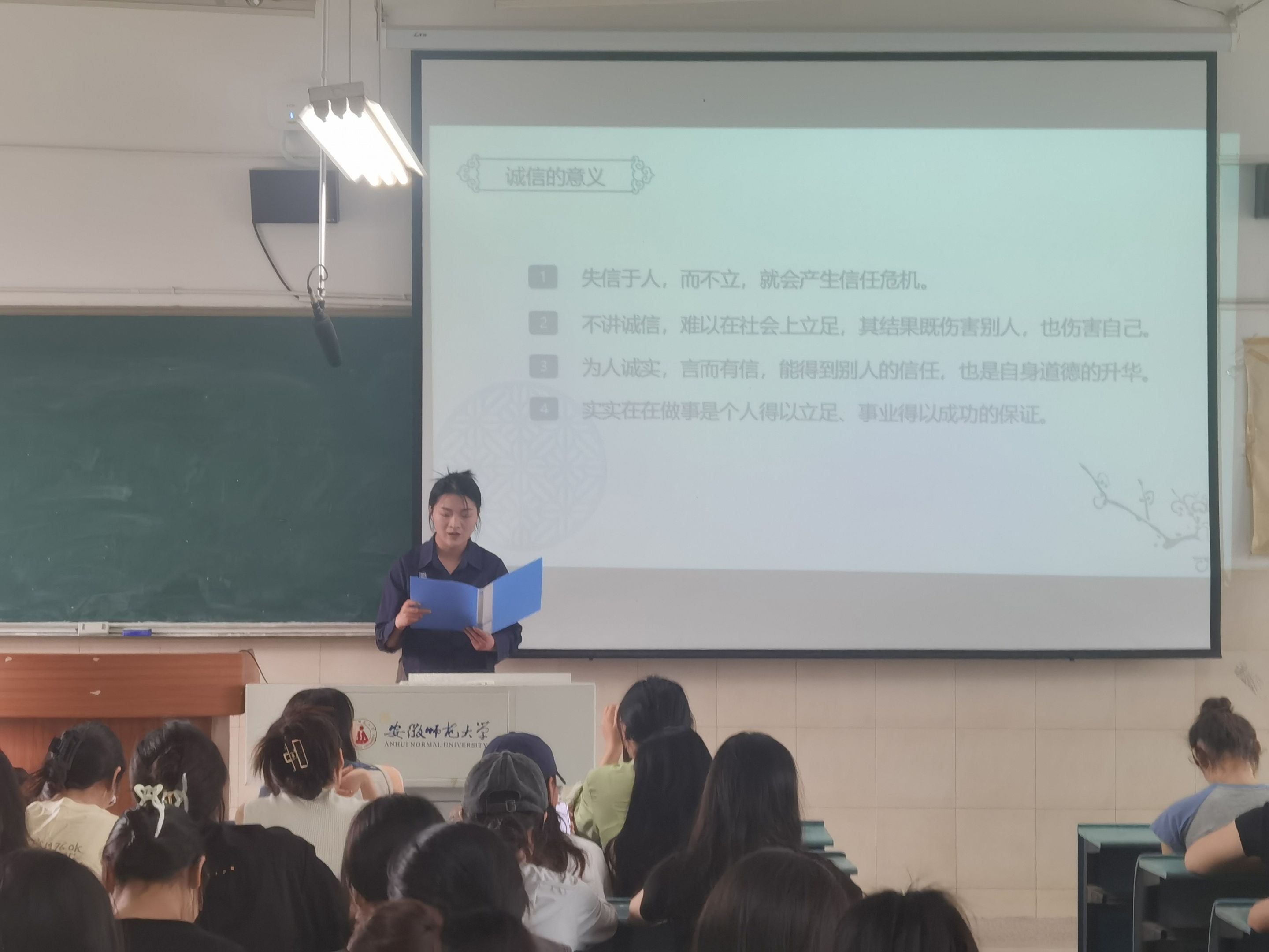 会上,李苗苗通过现实案例分析当代大学生诚信现状,让同学们了解到大学生失信的惨痛教训,譬如考试作弊、贷款逾期不还、抄袭作业、欺骗家长老师朋友等,并结合《民法典》中的内容,提高了同学们对《民法典》的认知,增强了同学们遵纪守法的意识。