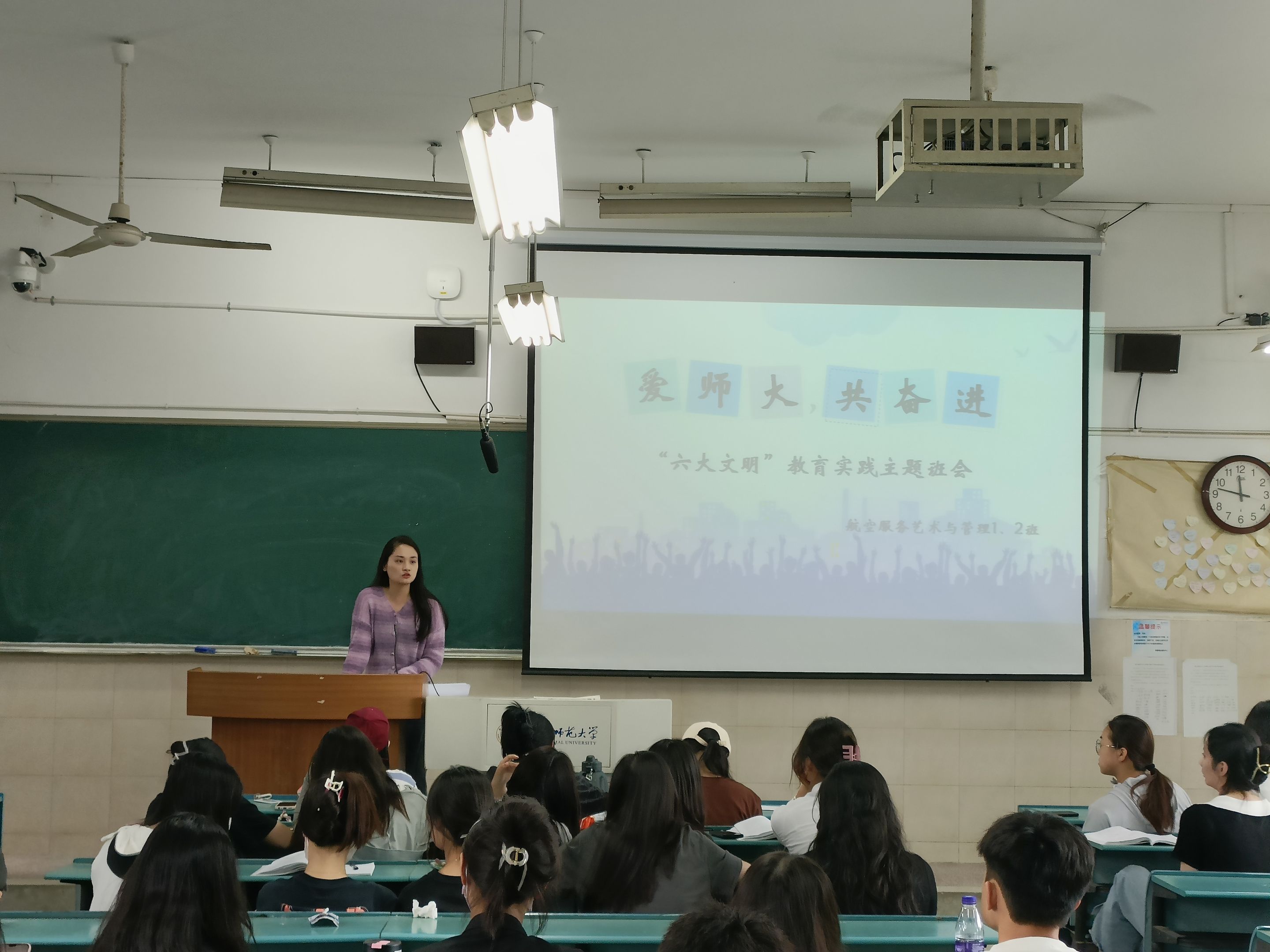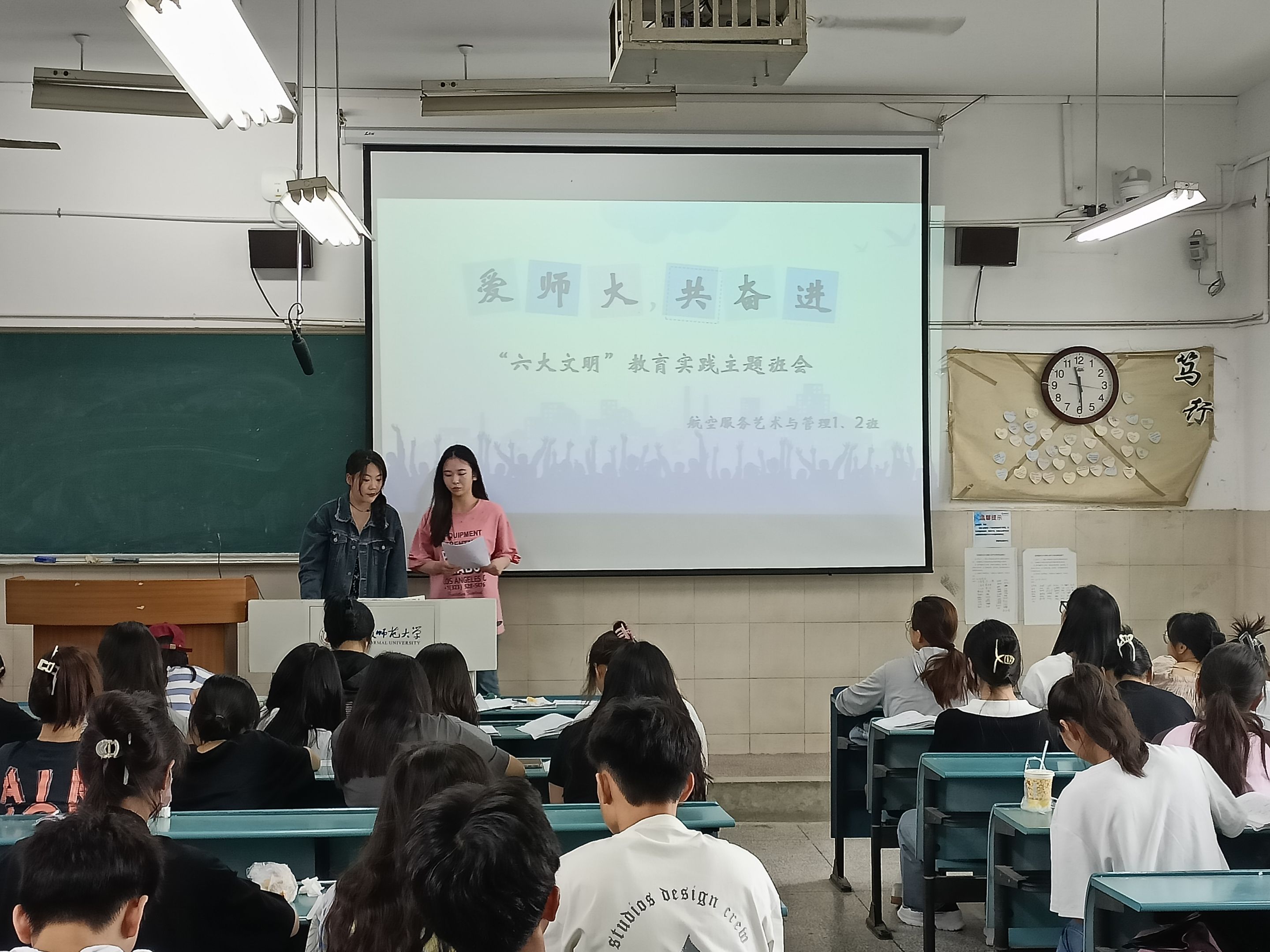 (本网讯 文/刘春燕 图/刘春燕)为共同构建文明校园,培养大学生的文明行为,6月7日,21航服务1、2班开展了“爱师大,共奋进·六个文明”教育实践主题班会,本次会议由安全委员刘亚南、丁文捷主持,1、2班全体同学参加,辅导员张雁、俞应芬参会。