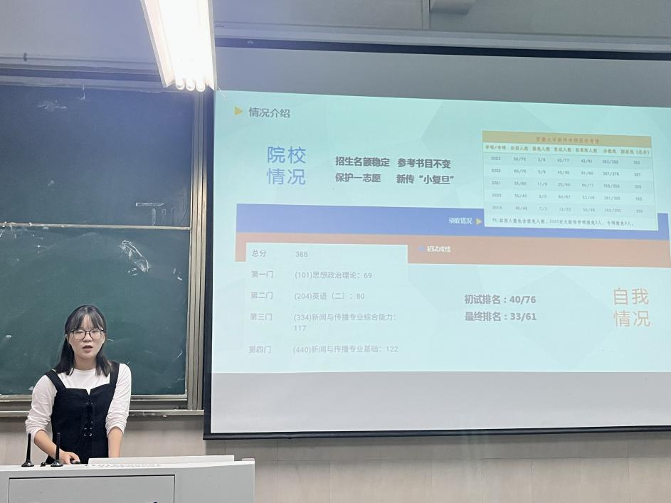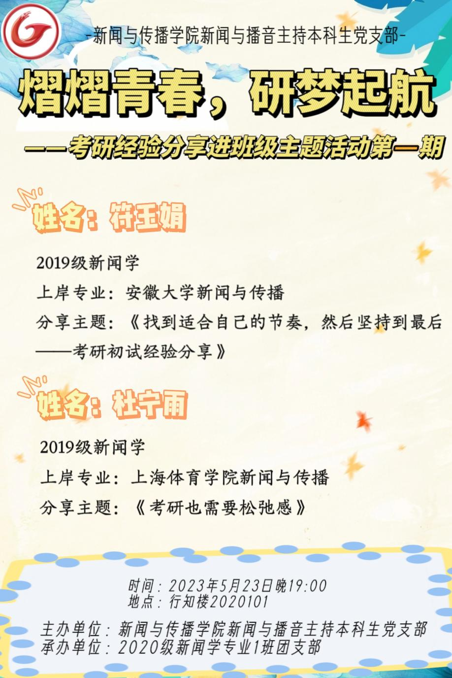 本网讯(文/丁嘉仪 图/王玉敏)为进一步做实主题教育,加强党员同学服务带动和引领作用发挥,加深意向考研学生对考研的认识和了解。5月23日晚7点,由2020级新闻学1班团支部承办的考研经验分享进班级活动第一期在行知楼2020101教室举行。活动由20新闻1班团支部书记丁嘉仪主持。本次活动中,本团支部邀请了2019级新闻学专业的符玉娟和杜宁雨做考研经验分享,专业辅导员梁嘉参加活动。