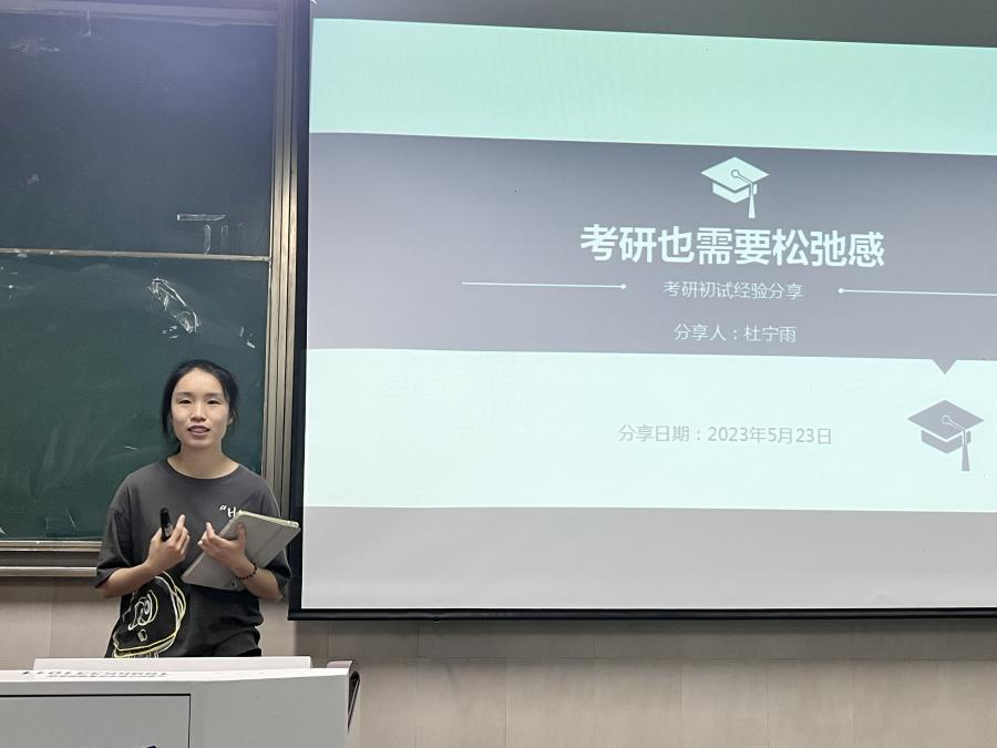 接着,杜宁雨以《考研也需要松弛感》为主题向大家做了分享。杜宁雨从如何劳逸结合、备考节奏、复习经验分享等方面进行了介绍。首先杜宁雨强调考研一定要放平心态。“我始终觉得如果你想要做成什么事情,你就按部就班做自己该做的,不要焦虑,不要内耗。慢慢努力一段时间过后,就可以水到渠成得达成目标。”杜宁雨说。其次,在备考过程中可以通过健身等方式释放压力,还能获得强健的体魄。在制定计划时可以设定每月几日的“休息日”用来放松。这样张弛有度的学习节奏可以大大提高学习的效率。最后在复习过程中要养成独立思考的能力,背书不能死背,要一遍背一边想作者的意图,看能否与现实实际挂钩。