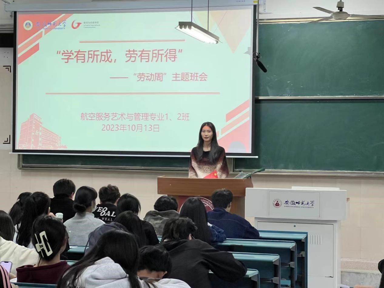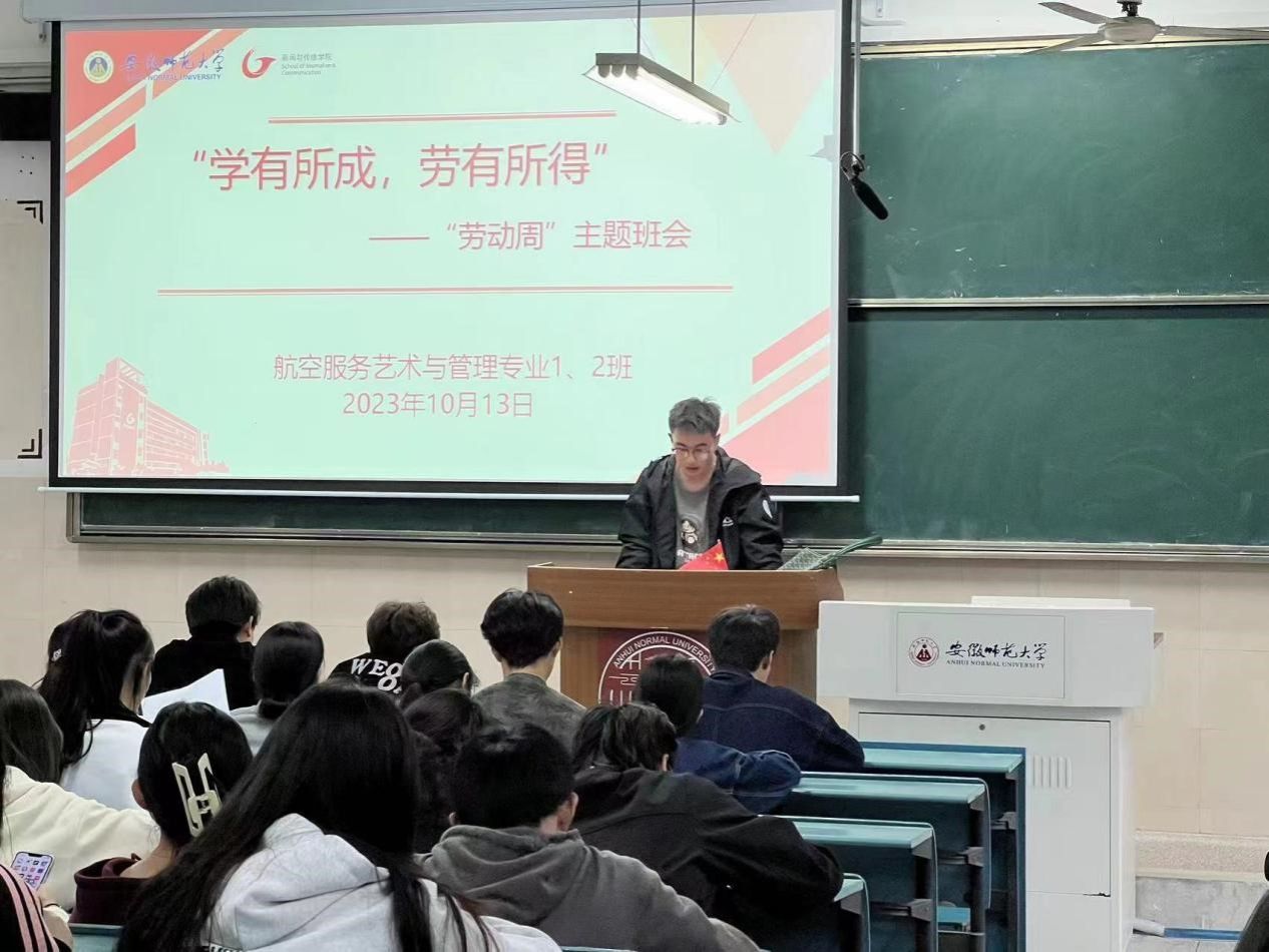 开展劳动教育是贯彻党的教育方针的重要举措,也是学生成长的必要途径,具有树德、增智、强体、育美的综合育人价值。为进一步引导同学树立正确劳动观念,培养积极主动的劳动态度,增强集体劳动意识,近期按照学院工作部署,2022级航空服务艺术与管理专业开展了为期一周的劳动教育实践活动。10月13日,劳动实践教育活动接近尾声,22航服专业1、2班在教学楼2050102教室召开“学有所成,劳有所得”劳动周总结班会,会议由22级航服专业1班班长穆可磊主持,辅导员汪笑笑及22航服专业1、2班全体学生参会。