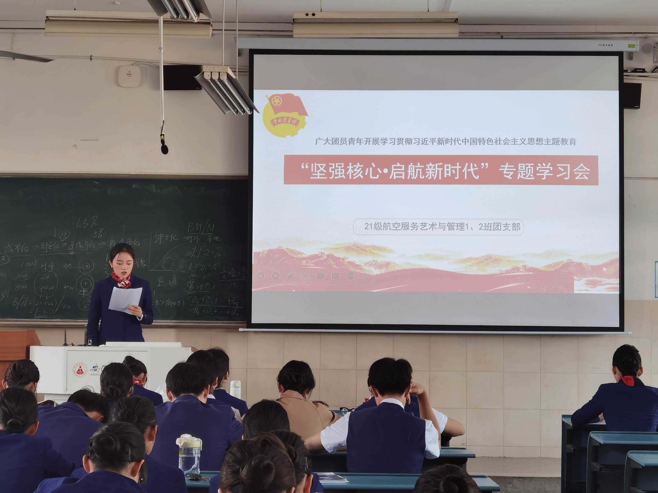 本网讯(文/洪迅洁 图/黄海玥)为提高团员青年们的思想政治觉悟,21航服1、2班团支部在2040504教室开展了“坚强核心,启航新时代”专题学习会。