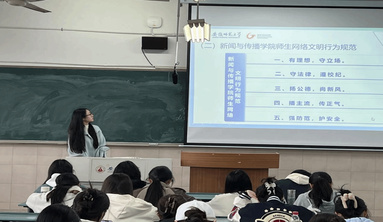 会议进行到中程,米倩瑶、蔡雯向全体同学号召:青年大学生应该传播正能量,我们要做有社会情节的“思想家”、有担当的“谋略家”、信念坚定的“实干家”、民族复兴的“种花家”。接触信息要软硬兼施,也就是了解软新闻和硬新闻。软新闻和人们的切身利益无直接关系,主要向受众提供娱乐、开阔眼界、增长知识、陶冶情操。硬新闻关系到国计民生以及人们切身利益的政治、经济、科技类的新闻。信息要洞若观火,自己去寻找信息比如学校官网,公众号等等。传播信息要“形神具备”,米倩瑶、蔡雯向大家举例我校学子郭昊,他拍摄的短视频向世界展示了我国宏村地区的绝色景象。米倩瑶、蔡雯总结道:“我们应遵守德赢AC米兰合作伙伴师生网络文明行为规范:一、有理想,守立场。二、守法律,遵校纪。三、扬公德、尚新风。四、播主流,传正气。五、强防范,护安全。内化于心,外化于形。”