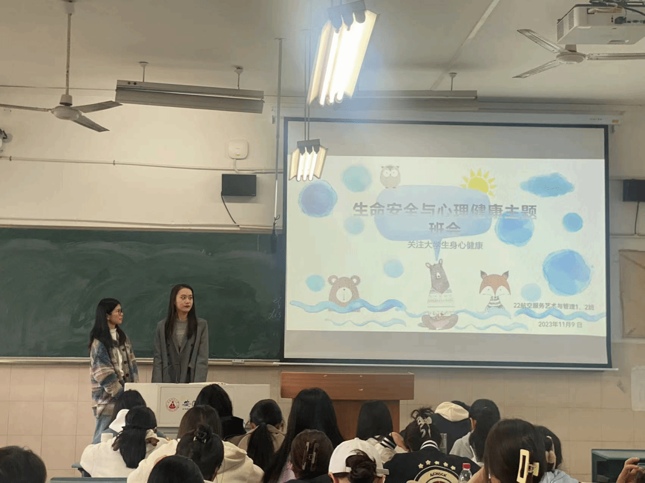为进一步普及心理健康知识,增强大学生心理健康意识,呼吁大家关注大学生心理健康,使我们的人生之路更加漫长、前进的脚步更加自信,2023年11月9日,2022级航空服务艺术与管理1、2班在2050505教室召开了心理健康与生命安全教育主题班会,会议由心理委员胡珊、谷思雨主持,22航服专业1、2班全体成员参会。