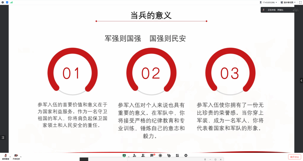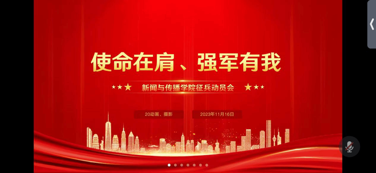 2023年11月16日晚,2020级摄影、动画专业征兵入伍动员会于腾讯会议线上召开,会议邀请2020级摄影入伍学生冯乐乐作主讲嘉宾,学院党委副书记吴青山参会并总结发言,2020级摄影、动画专业全体同学参加会议,会议由辅导员刘熠主持。会议共分为退伍士兵发言、互动交流提问和书记总结讲话三项议程。