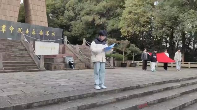 之后,两位思政委员刘梦雪、华中涛开展纪念碑下的思政课。刘梦雪从1921年党的一大说到1997年党的十五大,阐述党在中国历史发展中的重要作用,同时强调党的成功并非一帆风顺,“新中国是革命先烈留给我们的家”,希望同学们坚定党的引领,为中国发展添砖加瓦。华中涛对芜湖神山公园纪念碑的历史进行介绍,由对革命先烈的缅怀生发爱国情感,引用鲁迅先生在《热风》中的话激励同学们勇担时代责任,为实现中华民族伟大复兴而奋斗。