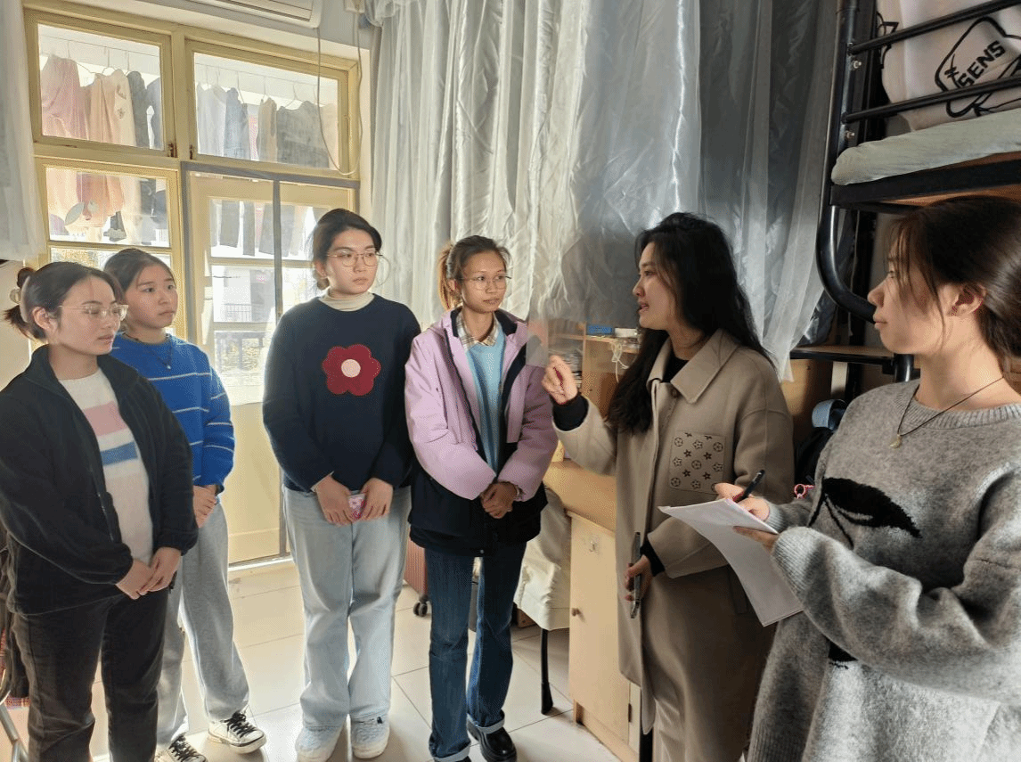为提高学生的安全意识,培养良好的生活习惯,及时排查寝室安全隐患,营造良好的寝室生活环境,2022级新闻学、广告学、网络与新媒体、播音与主持艺术专业辅导员李梦圆于12月6日中午带领宿舍楼层长、各班班委深入学生宿舍,开展冬季寝室安全和卫生检查工作。