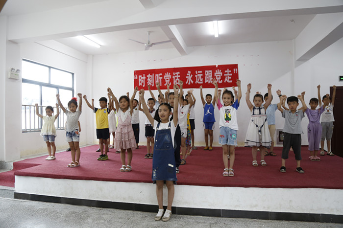 7月27日下午三点,演出正式开始,窗外却突然下起了大雨。暴雨浸湿了地上的热气,却浇不灭房间里大家的热情。“心中的小梦想,一天一天在成长......”忽然没了伴奏,小朋友们都停了下来,“天赐我一双翅膀......”志愿者们带着他们接着唱起来。原来,没了伴奏的歌声才是最悦耳的,稚嫩的声音直击心灵,那种震撼,让实践队员们热烈盈眶。稚嫩的歌声加上学生们整齐的舞蹈,让在坐的家长和志愿者们为之动容。实践队员们带来的朗诵《休宁恋》,字字道不尽心中所恋,声声唱不完师生情缘。