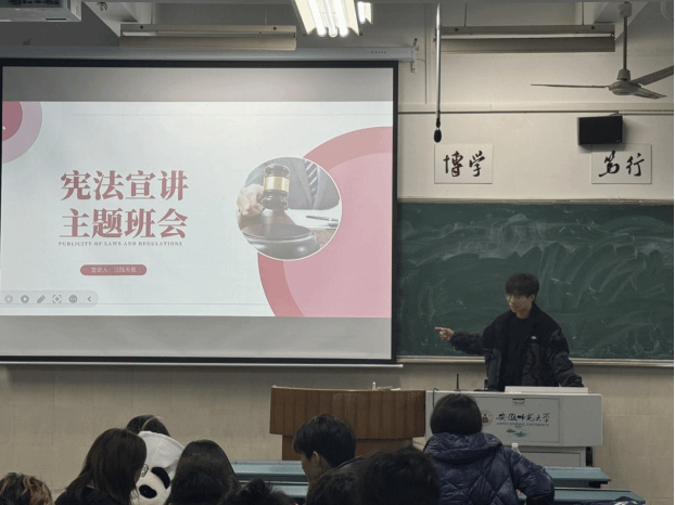 汪陆天枢首先带领大家学习了习近平总书记在第十个国家宪法日作出的重要指示,并结合法律案例向大家普及法律知识,宣讲宪法的意义和精神内核,提醒同学们时刻遵守法律,不违法乱纪。
