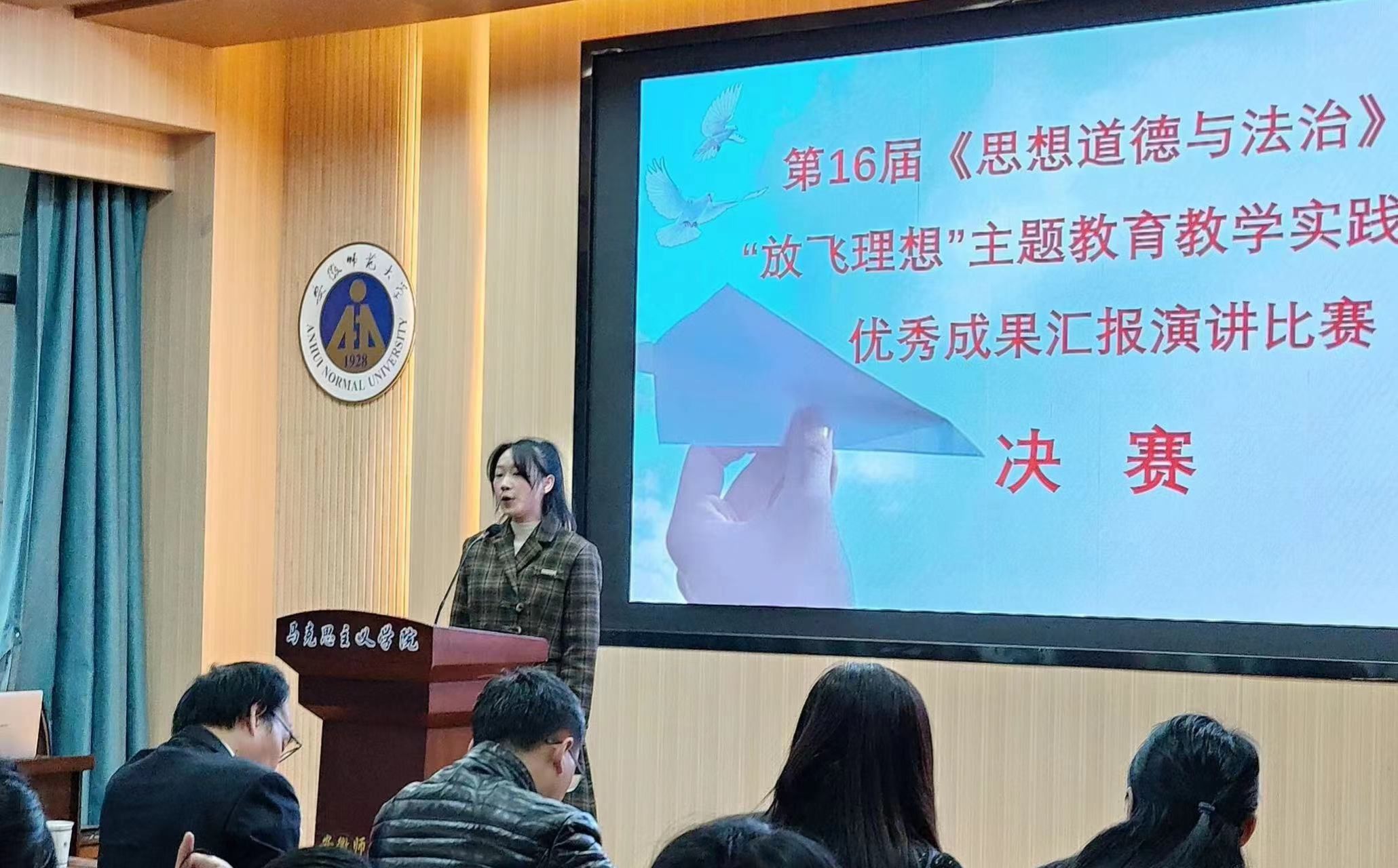 12月10日下午,第十六届《思想道德与法治》课“放飞理想”主题教育教学实践活动优秀成果汇报演讲比赛决赛在文典楼马克思主义学院一楼报告厅举行。经过此前紧张的班级选拔和校级初赛,我院2023级新闻二班王依纯同学顺利进入演讲比赛决赛并获得一等奖。