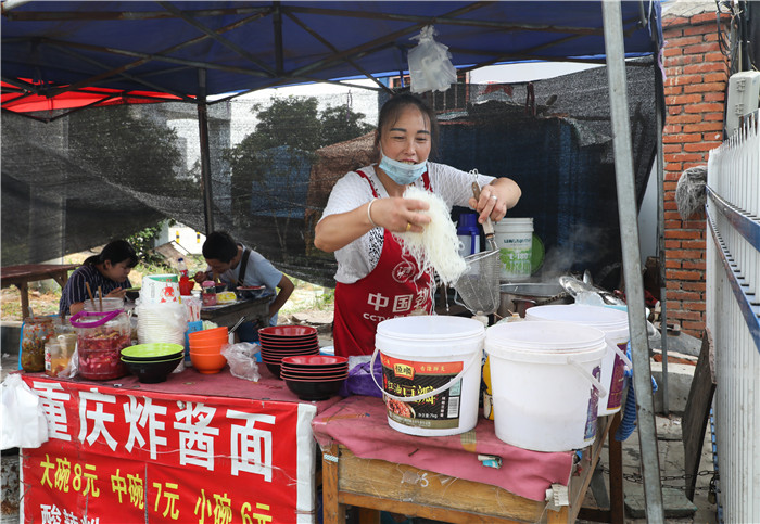 六点到七点半是摊点里客流量最大的时间段。水家湖高铁站的工作人员时常开着机车跨越三公里来点上一碗炸酱面;大周村村委会的干部每天赶到县城吃上两碗酸辣粉——这是本地人心中唯一一家“正宗的重庆味儿”;丰峡的村民也是摊点常客,在这里,他们能怀念起18年前那个埋藏在水底的村庄。