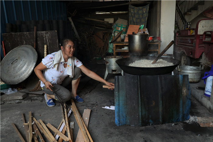 她从红色的三轮电动车上搬下两桶碗筷,在塑料大盆里装满热水,用可以产生大量泡沫的清洗剂缓慢地擦拭着碗里的油渍和污垢,不戴塑胶手套。在清洗一口绿色和蓝色的碗之间,她垂下脑袋,动作停滞了大约半分钟。